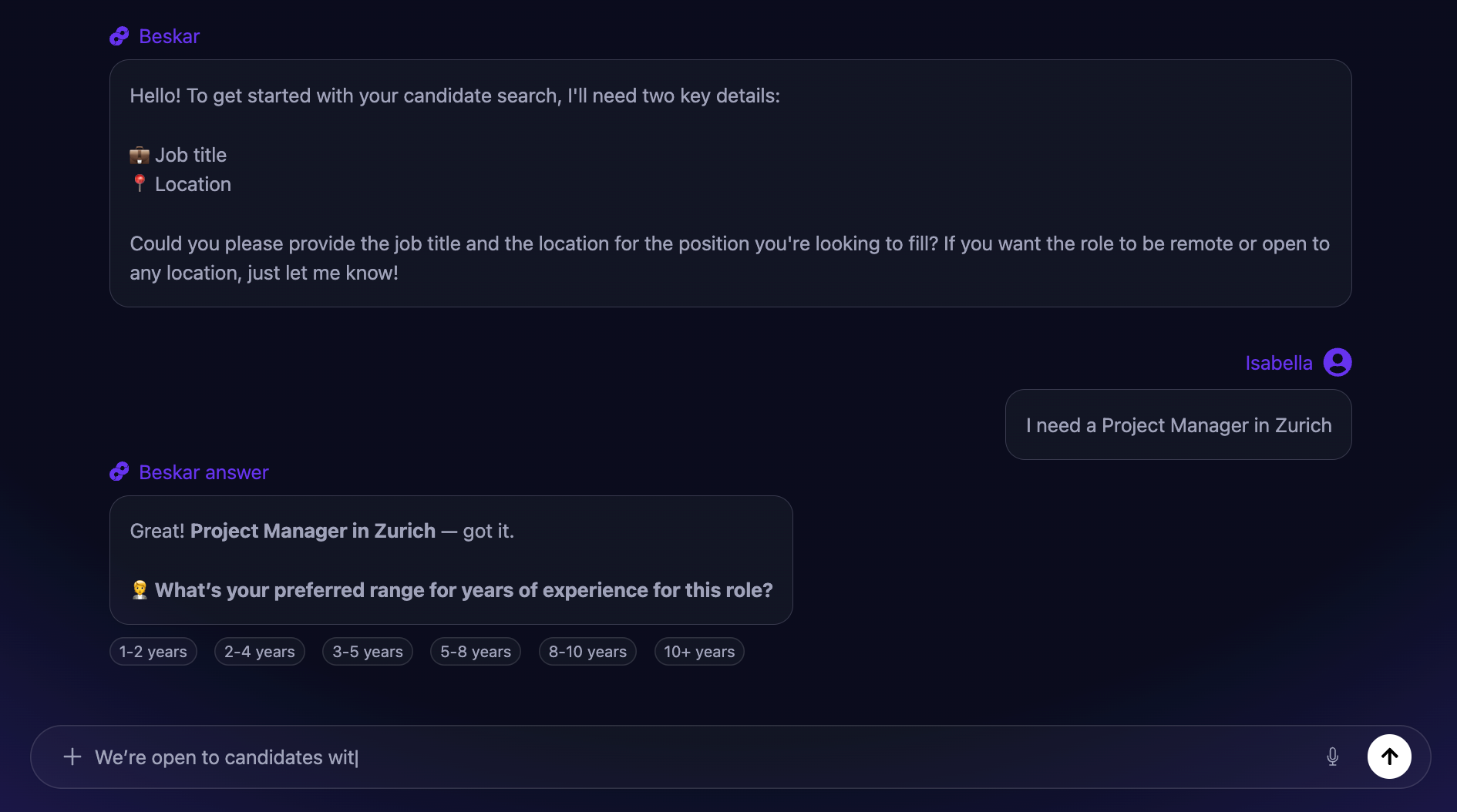 Explain what you’re looking for in your own words. The AI guides you through a short conversation to capture key criteria such as skills, certifications, experience, location, seniority, and languages.