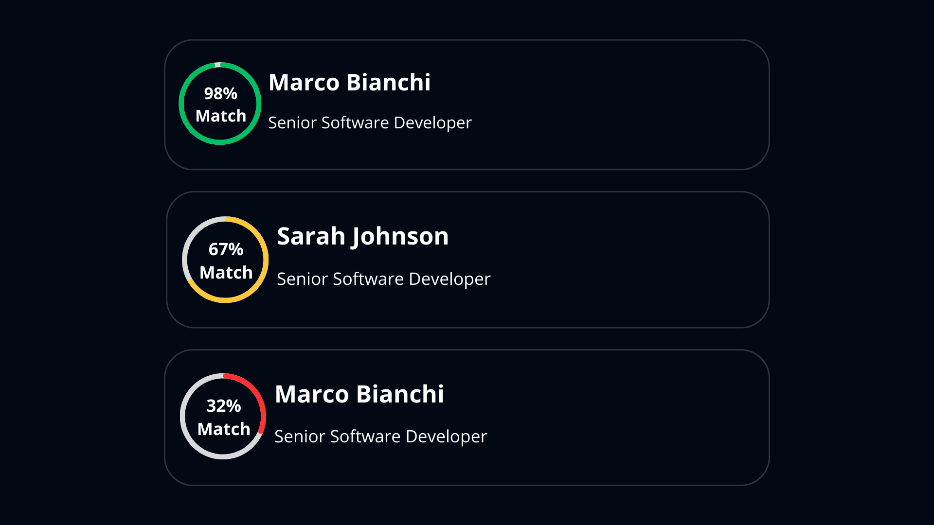 The system applies large language model analysis to assess each candidate against defined role requirements. Based on skills, experience and contextual factors, a match score is generated to support structured prioritization.